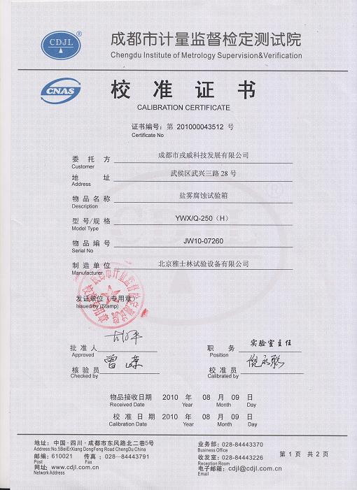>>盐雾腐蚀试验箱校准证书-成都计量院-戎威科技