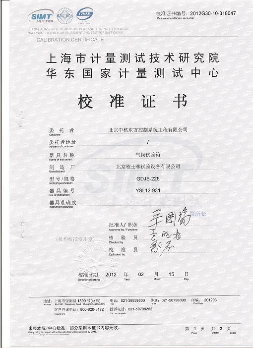>>气候试验箱校准证书-上海计量院-中核控制1