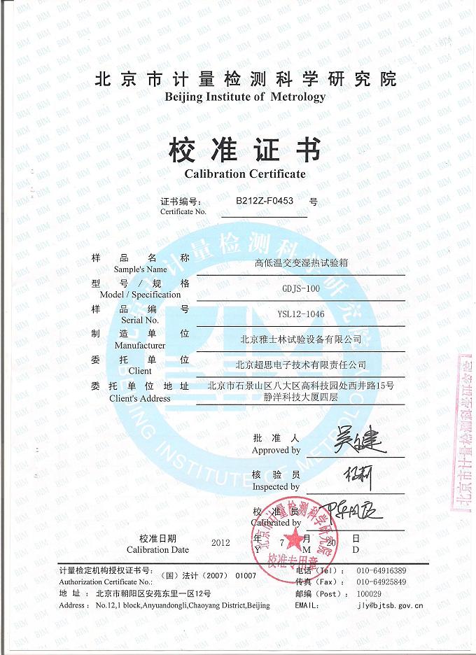 >>高低温交变湿热试验箱校准证书-北京计量院-超思电子