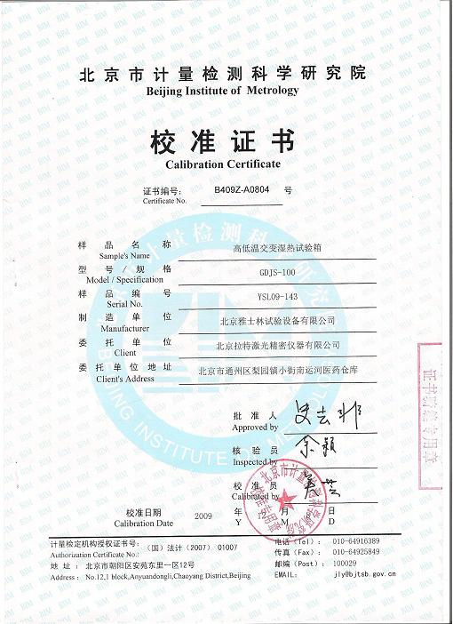 高低温交变湿热试验箱校准证书-北京计量院-拉特激光