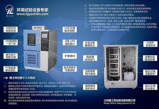 宝剑锋从磨砺出,梅花香自苦寒来。雅士林仪器持续创新,开发最前沿的测试技术,使雅士林的产品肯有更加大的生命力。雅士林仪器定位于中高端客户群,高品质、高性能高低温交变湿热试验箱系列的产品特点: 1、拥有外观设计专利,数控机床剪折、激光开孔,结构设计合理,新颖美观。 2、拥有自主知识产权和计算机软件著作权,掌握超低温制冷、温度自动补偿加热、浅槽加湿等环境试验核心科技。 3、控制系统采用日本进口优易控UMC系列7英寸高清真彩液晶触摸显示屏,温度控制采用P•I•D+S•S•R系统同频道协调控制,自动演算的功能,支持电脑实时监控、历史曲线回放、程序编辑、远程诊断等功能。 4、制冷系统采用原装法国泰康压缩机组,制冷剂采用美国杜邦品牌,制冷效果强劲,性能稳定。 5、电气系统核心电气元器件均采用施耐德、欧姆龙等进口知名品牌。 6、加湿系统采用国际流行的浅槽式加湿方式,加湿效果及湿度控制更精准。 7、照明系统采用飞利浦套件,观测窗采用漏斗形设计,观测视野更开阔。 8、抽屉式加水方式,超大水箱设计,持续试验时间更长。 9、沿袭国外环境试验设备先进设计理念,水路、电路完全分离,使用更安全。 10、独有的漏电保护设计,超温、超压、过载、过电流保护,操作更安全。 11、标准化图纸接线、焊接,三十五项严格检验流程,确保设备质量,无安全隐患。 12、专注于细节,引线测试孔防锈设计、进口硅橡胶密封条双层密封、高品质可固定式PU脚轮设计、工作室底部引流槽设计等。 全国免费服务电话:4006 400 998 |